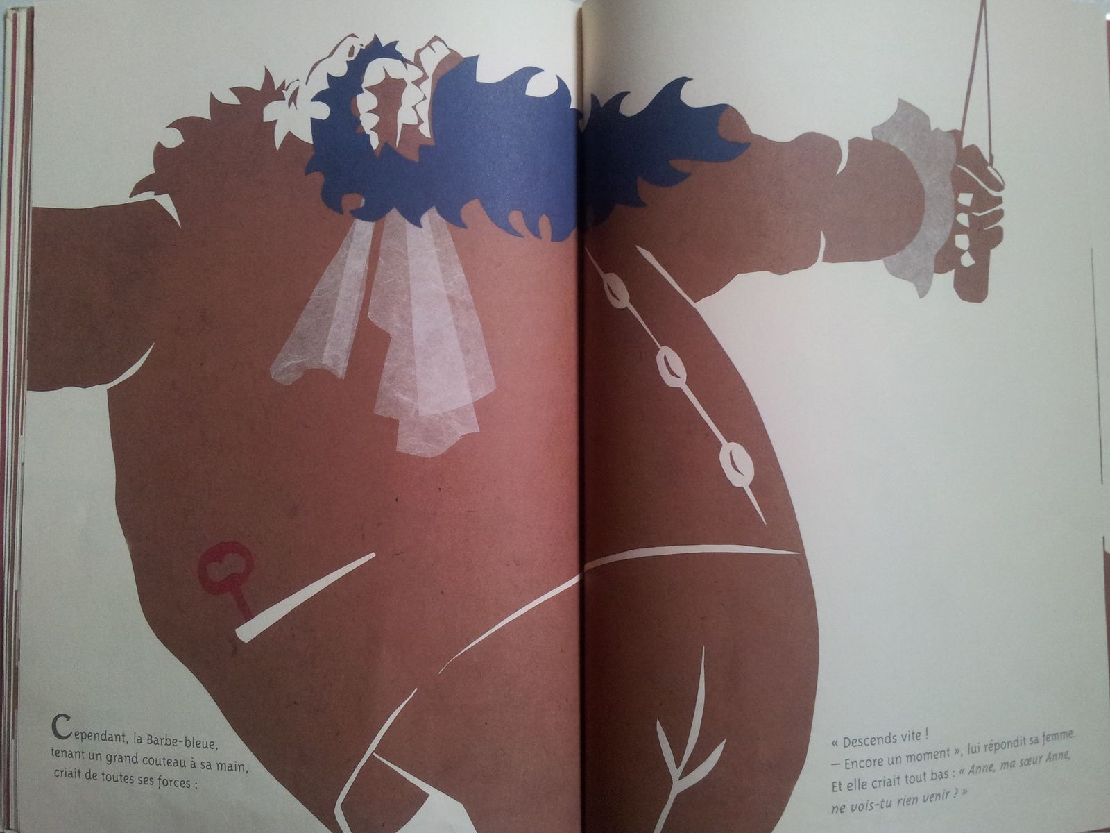 Plus je lis cette histoire, et plus elle me plaît. Ou plutôt, le traitement qui en est fait : les petits changements, dans le texte et surtout dans les illustrations. Chacune met l’accent sur un ou plusieurs détails : l’aspect corporel de Barbe-Bleue, son attitude ou celle de sa jeune femme, alors que d’autres détails restent à l’identique. Dans toutes les versions, Barbe-Bleue est un homme à la carrure impressionnante : grand, carré, hautain, il est ici aussi gros que sa femme est fine (c’est une constante). La barbe est fournie, bouclée et assez longue. Il est beaucoup représenté, la tête en arrière et la bouche ouverte, lui conférant une tête animale, la barbe devenant crinière. Oui, ce Barbe-bleue là est bestial !